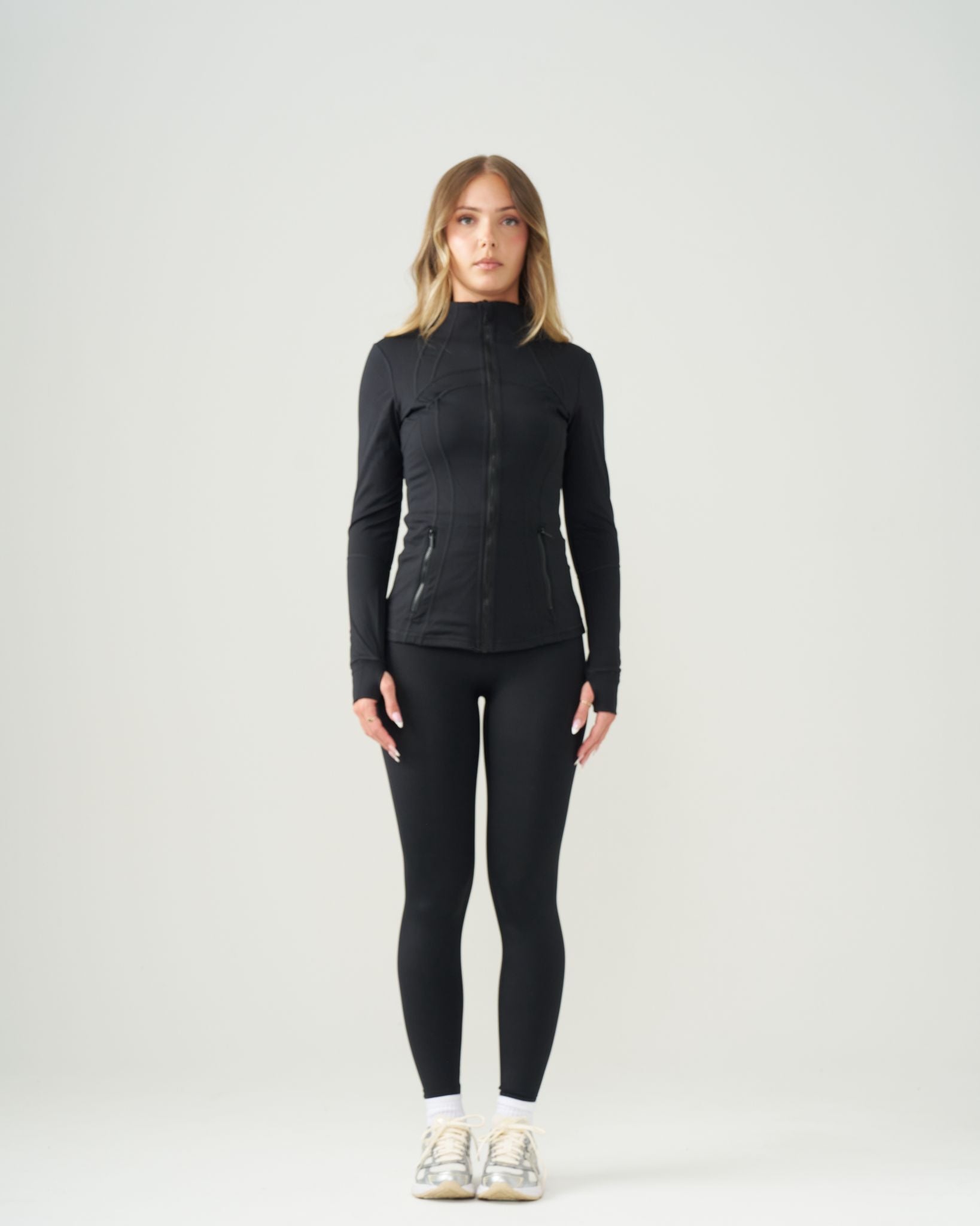 MATERIAL: 80% Nylon, 20% Spandex FABRIC WEIGHT: 280 GSM FIT: Form-fitting, supportive. DESIGN: A full-zip performance jacket with a high collar, thumbholes, and secure zippered pockets. The matching full-length leggings have a high-waisted design for a secure fit.
